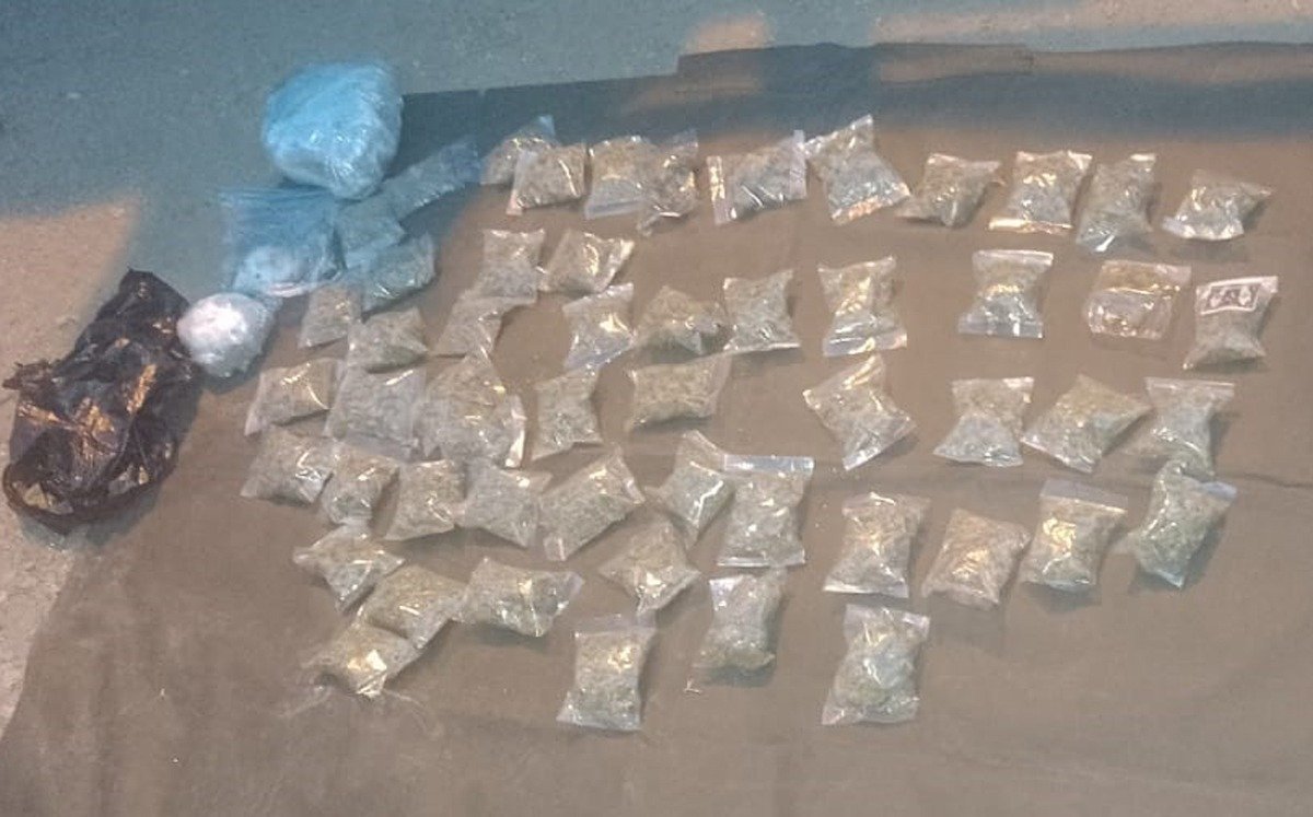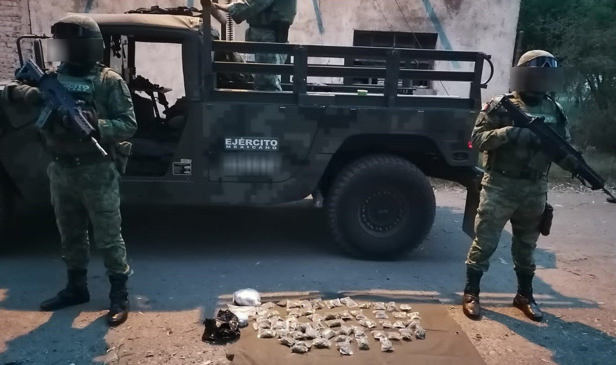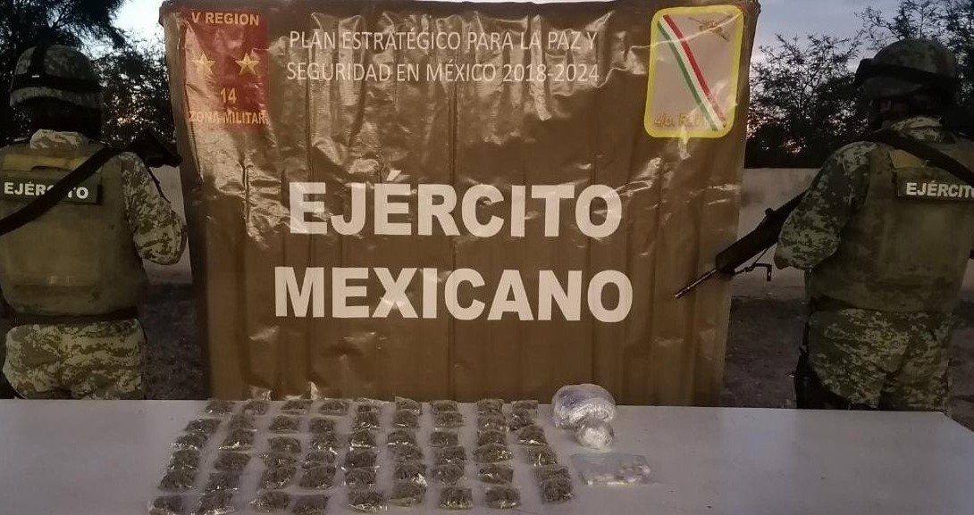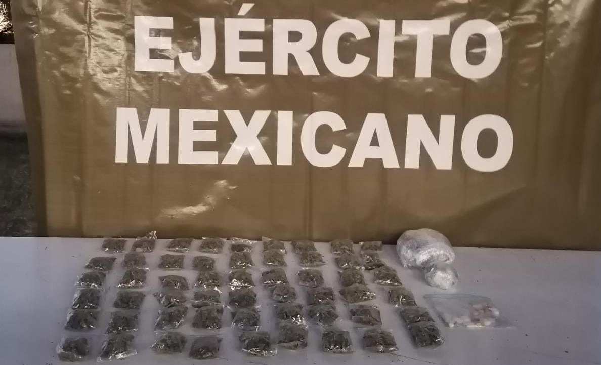 Los militares aseguraron la bolsa, que contenía 55 envoltorios con marihuana, algunos con la leyenda CJNG; un paquete con 400 gramos de la misma droga, 13 envoltorios con crystal y 4 más con cocaína.