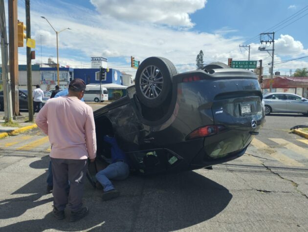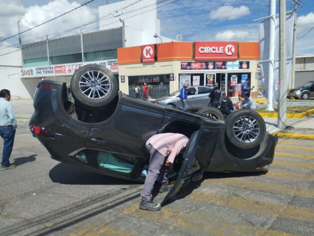 Por pasarse la luz del semáforo en rojo una vagoneta Mazda provocó que fuera impactada por otra unidad de motor, por lo que terminó volcada sobre su toldo; el conductor y su acompañante fueron atendidos por elementos policiacos municipales con conocimiento en primeros auxilios.