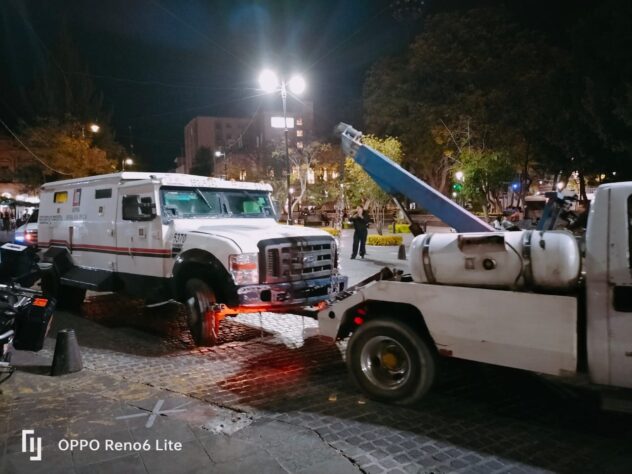 A una camioneta blindada se le botó la velocidad mientras se encontraba estacionada en plena Plaza Principal, por lo que la pesada unidad circuló sin tripulante alguno y terminó llevándose de corbata una motocicleta y estampándose contra la Catedral de Aguascalientes, por fortuna no hubo personas lesionadas.