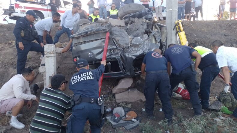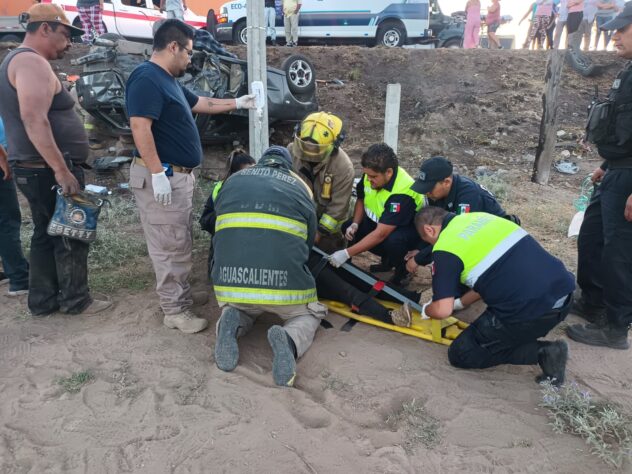 Un vehículo en el que viajaba una familia completa sufrió una aparatosa volcadura sobre la carretera 45 Norte, en el municipio de Rincón de Romos, donde dos adultos resultaron lesionados, así como dos menores de edad; una mujer que quedó prensada fue trasladada de emergencia a recibir atención médica.