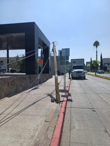 El conductor de un camión se llevó de corbata varios cables y 7 postes nomás, cuando maniobraba sobre el bulevar Colosio, donde uno de los postes le cayó encima a un coche nuevo de exhibición en una agencia de autos.