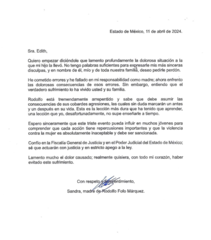 «Sra. Edith, Quiero empezar diciéndole que lamento profundamente la dolorosa situación a la que mi hijo la llevó. No tengo palabras suficientes para expresarle mis más sinceras disculpas, y en nombre de él, mío y de toda nuestra familia, deseo pedirle perdón», se lee en los primeros párrafos de la carta.