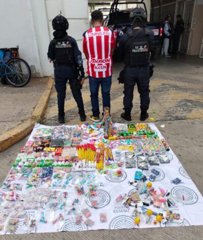 Los uniformados de la Secretaría de Seguridad Pública del Estado, en coordinación con elementos de la Coordinación Municipal de Protección Civil, realizaban un recorrido de vigilancia en dicho centro comercial cuando en el cruce de las calles Tianguis y Comercio detectaron a un sujeto que tenía en su poder artefactos pirotécnicos.