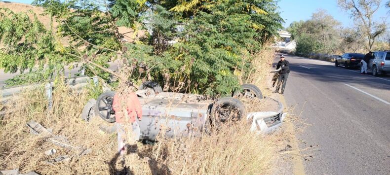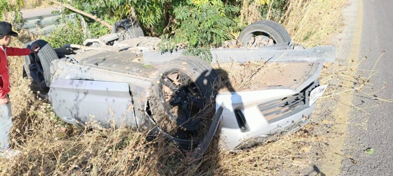 Un joven se salvó de morir tras sufrir un fuerte accidente tipo salida de camino y volcadura en el municipio de Rincón de Romos al volante de su automóvil deportivo.