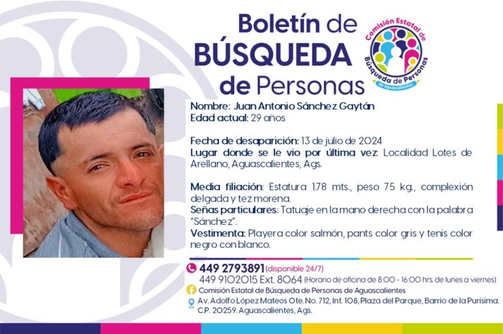 La Comisión Estatal de Búsqueda de Personas de Aguascalientes, ayer lunes, volvió a difundir públicamente el boletín de búsqueda de Juan Antonio para continuar precisamente con su búsqueda pese al tiempo transcurrido desde su desaparición forzada.