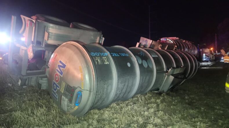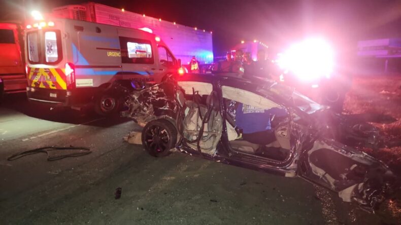 Su coche quedó destrozado por completo y el segundo remolque del camión de carga terminó volcado fuera de la cinta asfáltica y presentó derrame del combustible que transportaba, que fue contenido por elementos del Departamento de Bomberos Municipales.