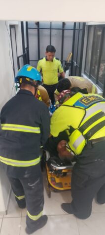 Un hombre y una mujer resultaron lesionados con fracturas en sus extremidades inferiores tras la caída de un elevador desde una altura de 8 metros, aproximadamente.