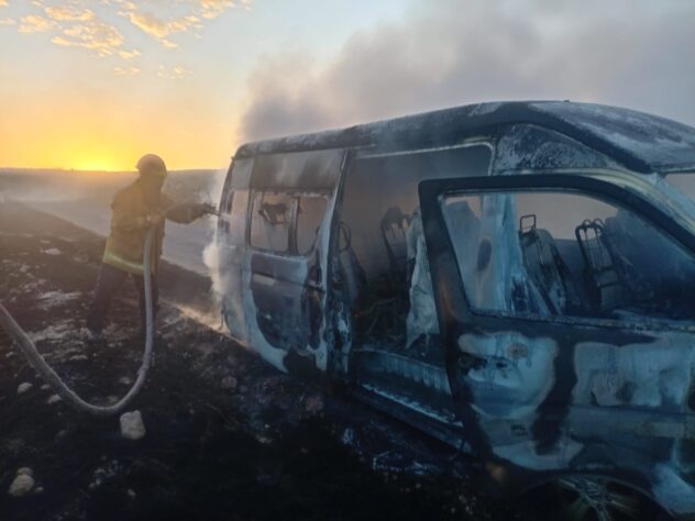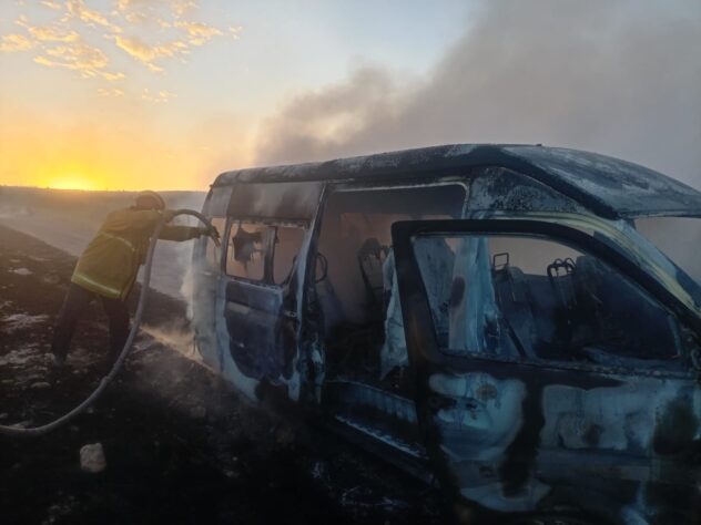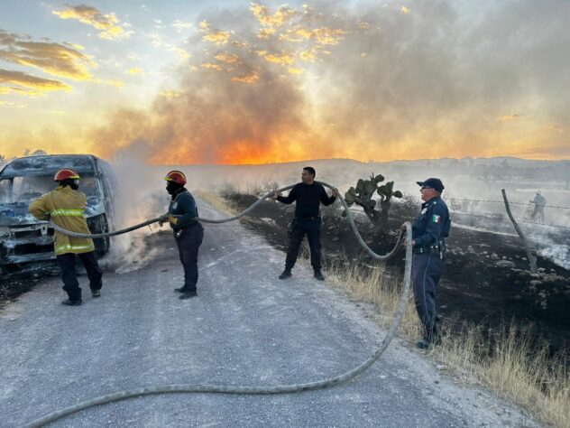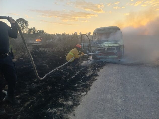 El operador, este miércoles, minutos después de las seis de la tarde, transitaba por la terracería que comunica las localidades Santa Elena de la Cruz y el Ejido Morelos, en Rincón de Romos, cuando repentinamente la combi de transporte público comenzó a incendiarse.