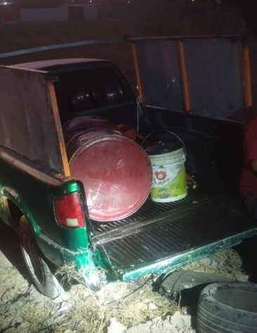 Los elementos detuvieron a los dos sujetos, que dijeron llamarse Fernando “N”, de 30 años, y Jesús “N”, de 25, y les aseguraron una camioneta GMC, en color verde y con placas de circulación de Aguascalientes, en cuya caja se encontró otro tambo rojo de 200 litros con restos de líquido en color negro, identificado como aceite.