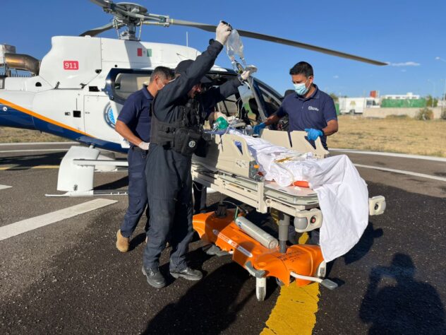 Al catalogar en riesgo su vida ya que sufrió algunas complicaciones, el propio personal solicitó el apoyo de la Policía Estatal con el helicóptero para trasladarlo de inmediato a la ciudad capital para su atención especializada.